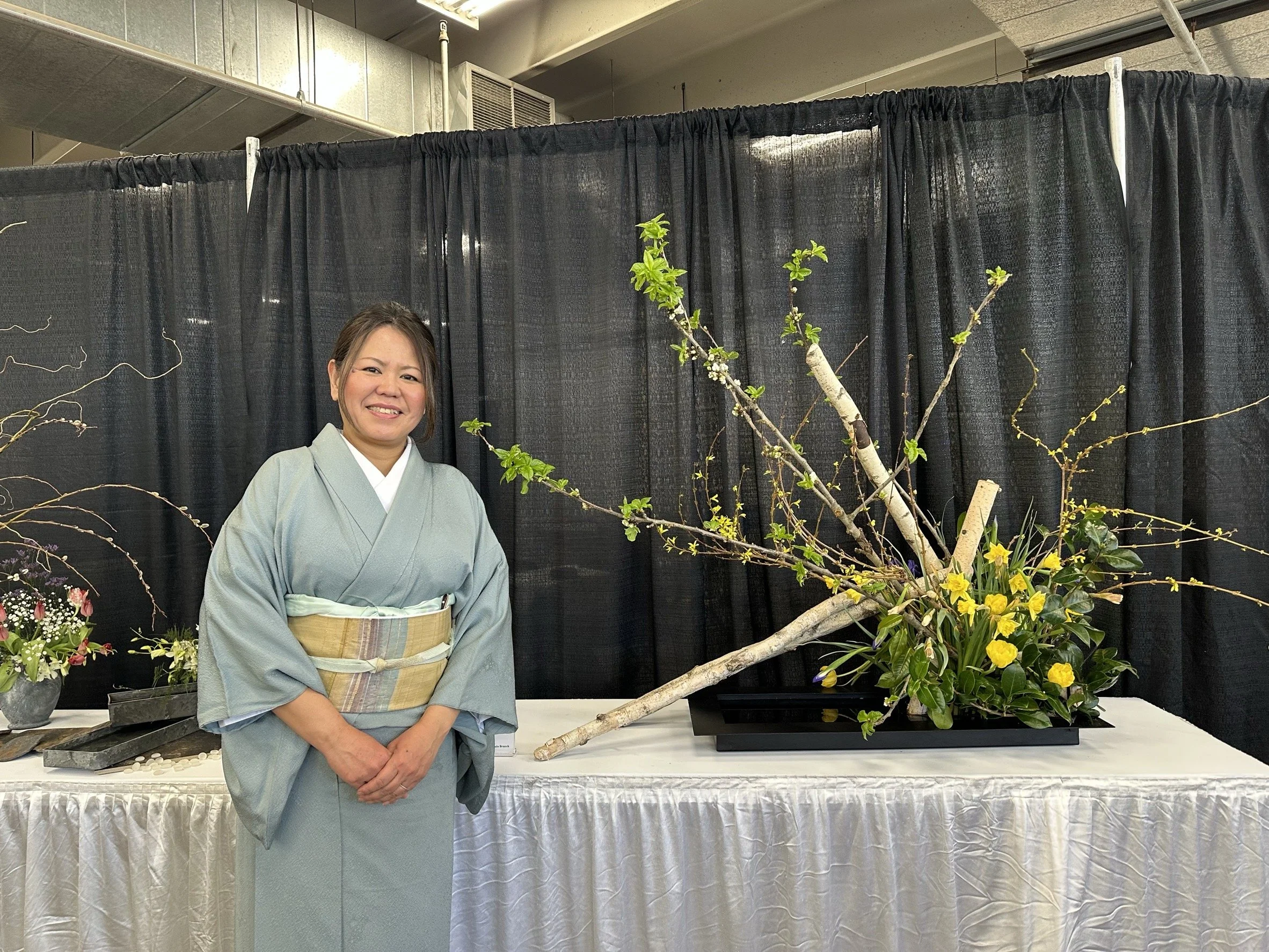 2002年カリフォルニア州からコロラド州へ移住、2003年より大畑先生のもとでいけばなを学び始め、現在は吉川先生のもとでお稽古を続けており、東京の草月本部やアメリカ各地での定期的な研修などを通じて、日々その研鑽を積んでいます。現在、草月流の師範「一級常任総務」の資格を保持しており、いけばなインターナショナル(I.I.)デンバー支部Chapter 66の共同会長を務めるとともに、デンバー植物園にていけばな教室の指導にあたっています。